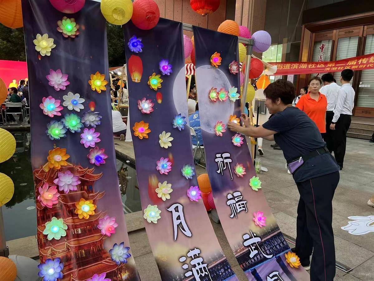 本次活动是在武汉市武昌区新时代文明实践中心指导下,由水果湖街新时代文明实践所、水果湖街滨湖社区新时代文明实践站主办,湖北木兰花社会工作服务中心承办。活动现场张灯结彩,长长的市集一路延伸,居民安闲自在地徘徊其间,可以做花灯、吃月饼,更有趣味游戏打卡赢礼品,华服和民族服饰换装秀拍照打卡,现场茶百戏展示非遗文化,还可以点亮祈福荷花灯、许下心愿……