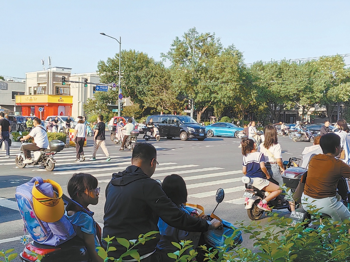 在十字路口西南角,由于附近有学校,每隔一会儿就有带着孩子的骑行家长。他们几乎都没有佩戴头盔,更不用说给孩子戴儿童头盔了。当绿灯亮起,路口一角的电动自行车和快递外卖车,便迅速起步,往北或往东混入电动车流中,看得人胆战心惊。