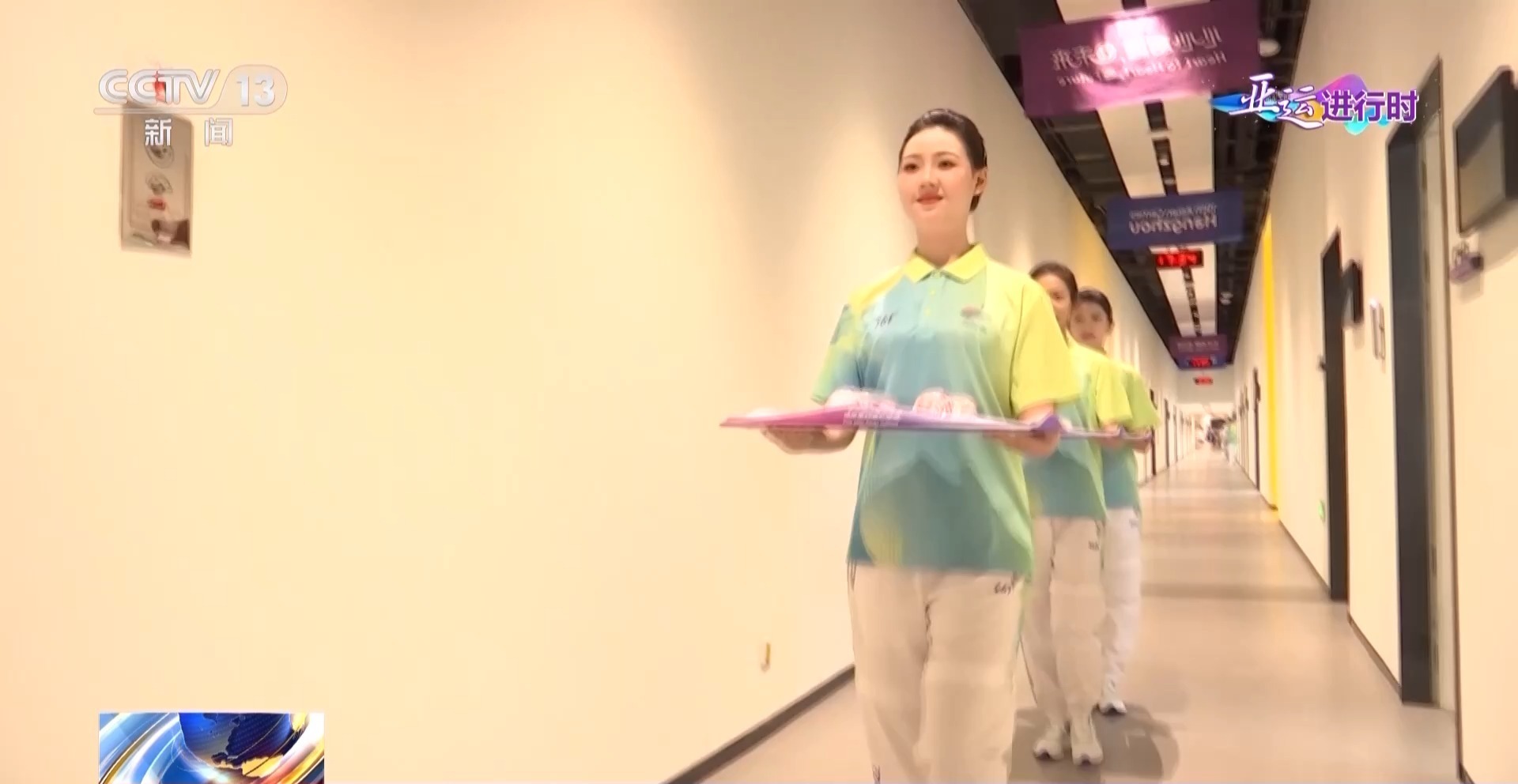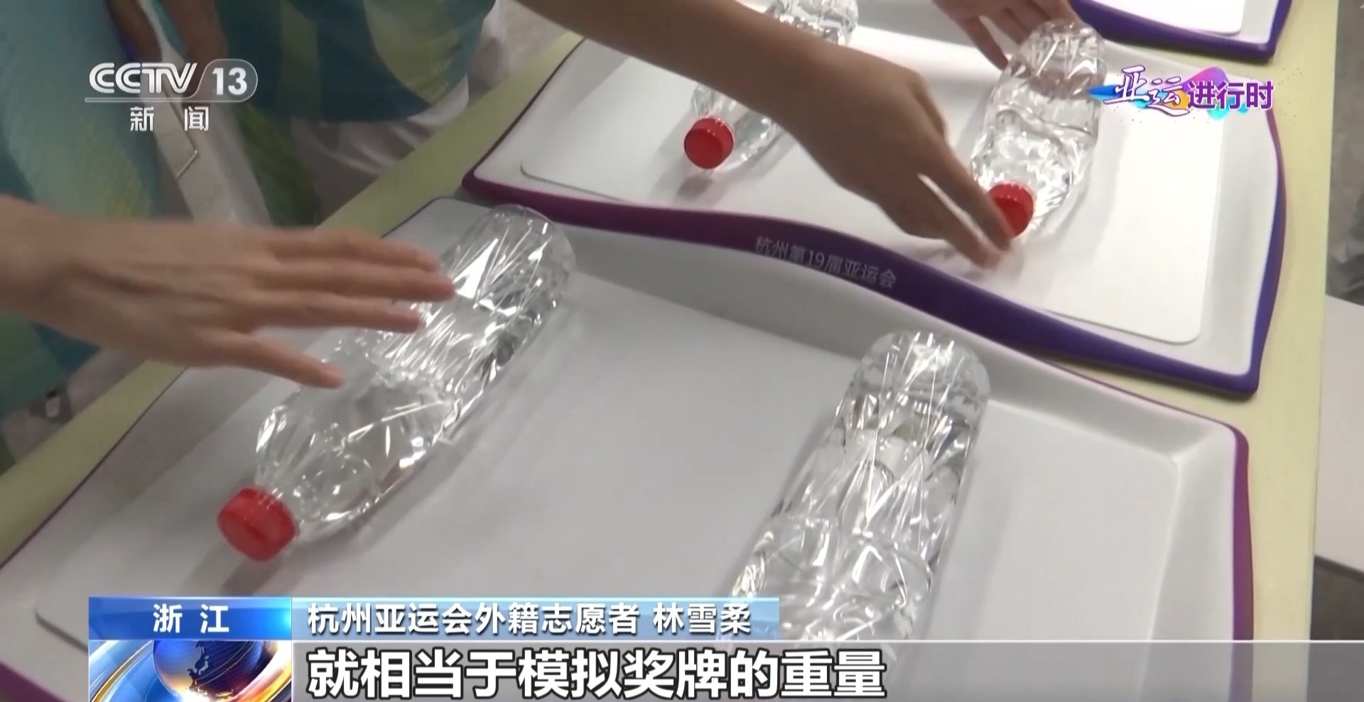 杭州亚运会外籍志愿者 林雪柔:在培训的时候,大家会有一个负重的训练,要托4瓶矿泉水,就相当于模拟奖牌的重量。站在一个位置上,一到两个小时,大家都坚持下来了。