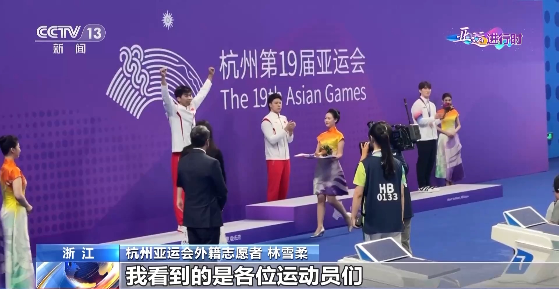 杭州亚运会外籍志愿者 林雪柔:更多我感觉的是荣幸,因为我们能够以颁奖礼仪志愿者的一个身份,在颁奖典礼上为他们递上奖牌。我看到的是各位运动员们,他们非常热爱这个项目的一种精神,对我来说是一个非常大的鼓舞,要保持这种热爱的心,在自己热爱的事情上努力。