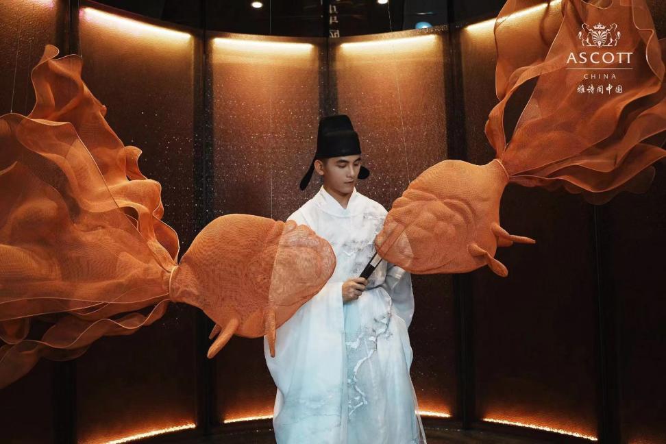 一楼艺术装置——“空中锦鲤”,留下了许多“坊客”与lyf的第一张合影。两只橘红色的镂空锦鲤在空中浮游,既展现唐朝的崇“鲤”文化,也暗含中国传统文化中吉祥如意的美好祝愿。