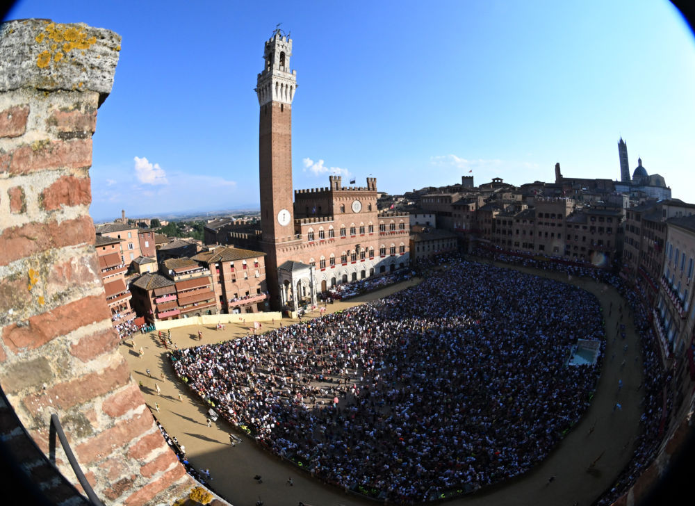 8月16日,锡耶纳赛马节在意大利托斯卡纳大区古城锡耶纳市中心的田野广场举行,吸引了众多观众前来观看。锡耶纳赛马节是世界闻名的意大利传统民间活动,始于1656年,每年7月2日和8月16日举行两次。新华社发(阿尔贝托·林格利亚摄)