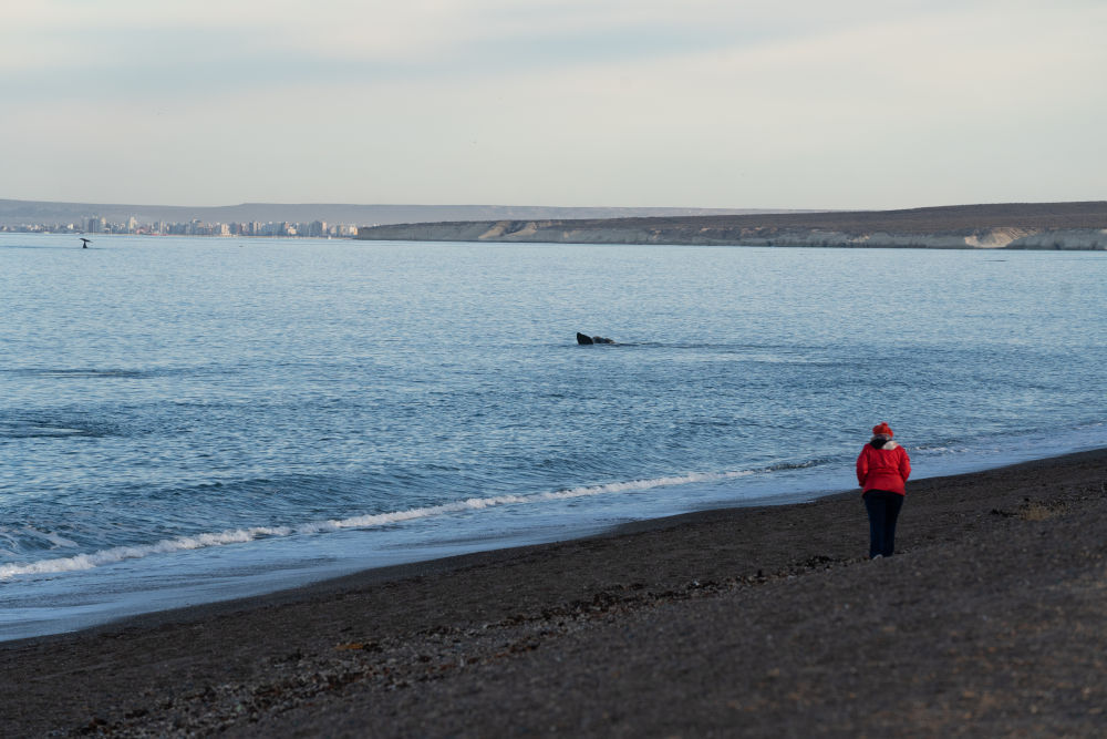 6月13日,在阿根廷马德林港,游客在海滩上观赏南露脊鲸。新华社记者王钟毅摄