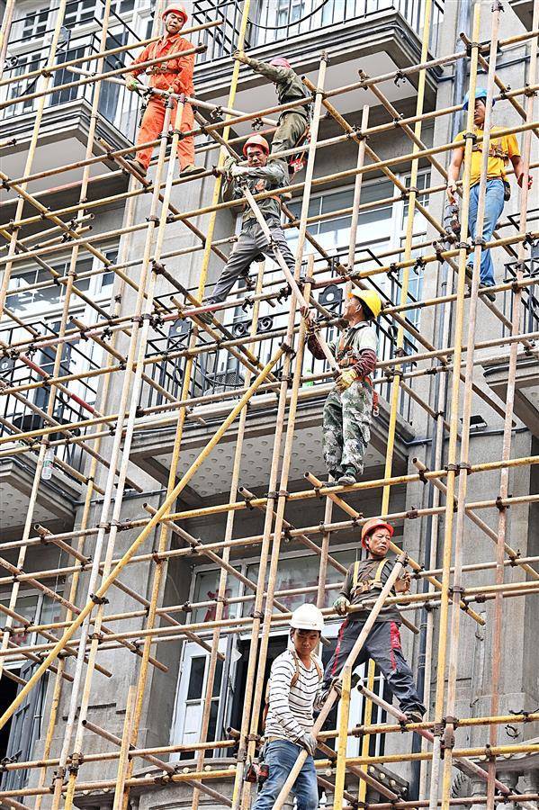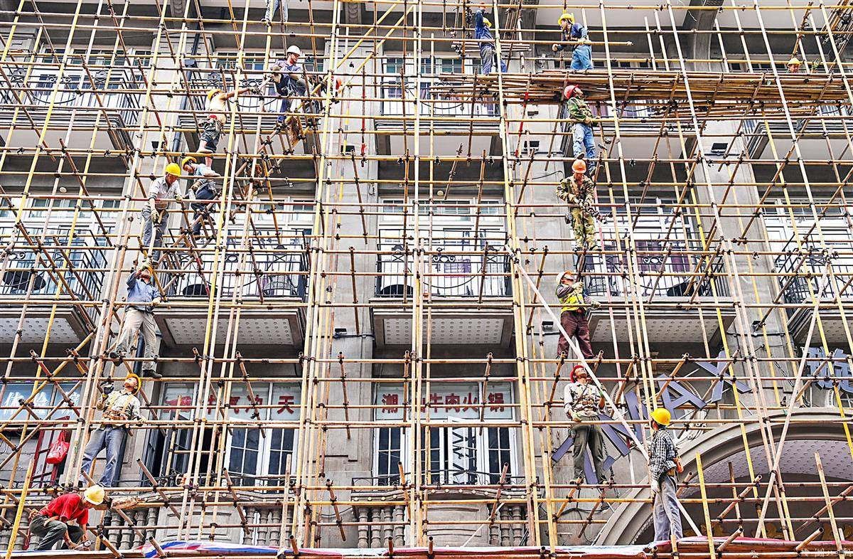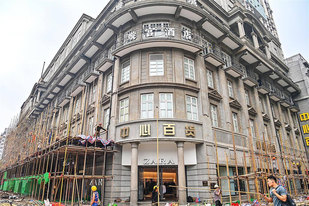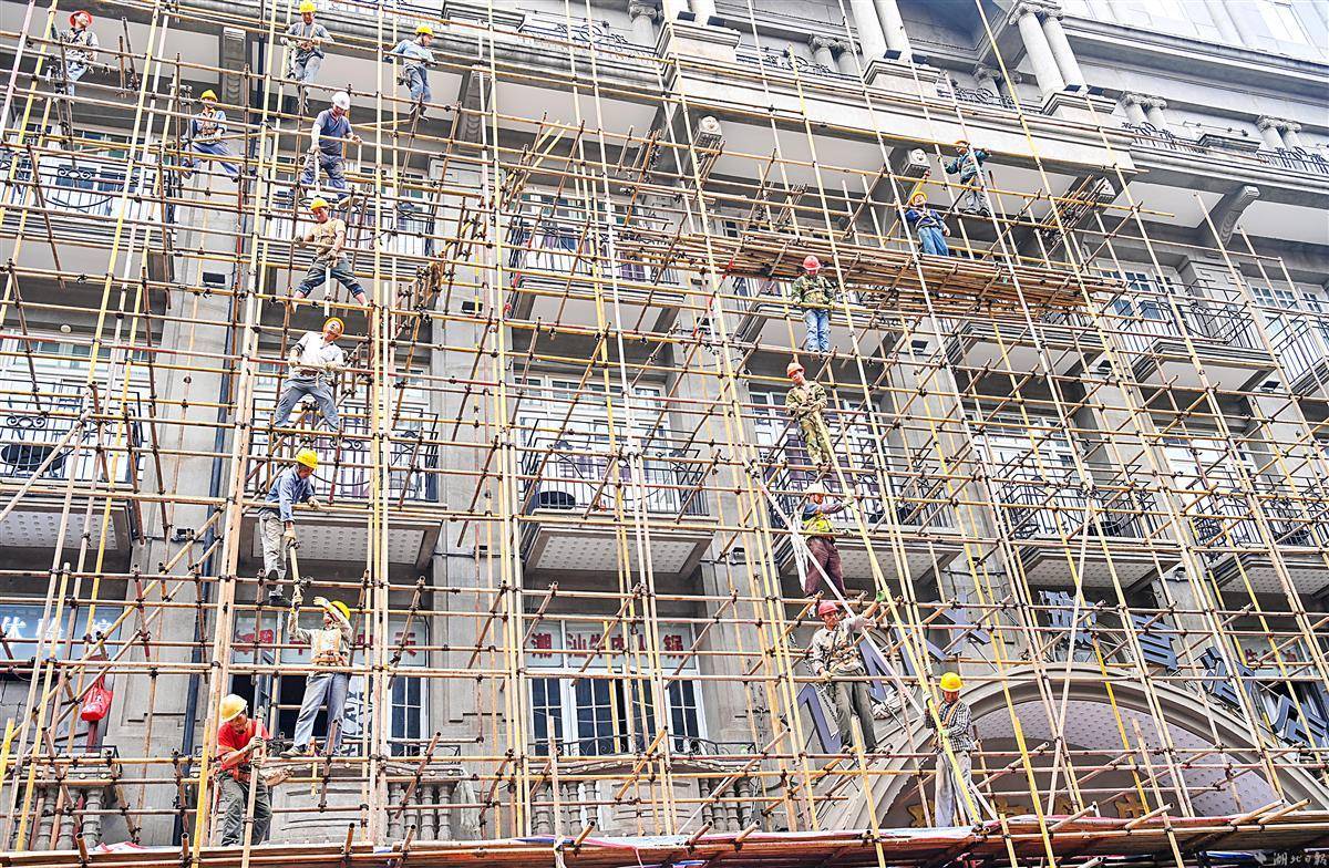 9月27日,近百名施工人员有序地拆除武汉中心百货大楼外墙的脚手架,大楼修旧如旧,国庆节期间将换上“新装”,整体环境焕然一新。