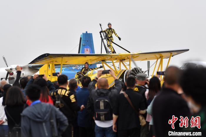 2023太原国际通用航空博览会28日在山西太原开幕,“猫女”机翼行走飞行特技表演引航空爱好者围观。 韦亮 摄