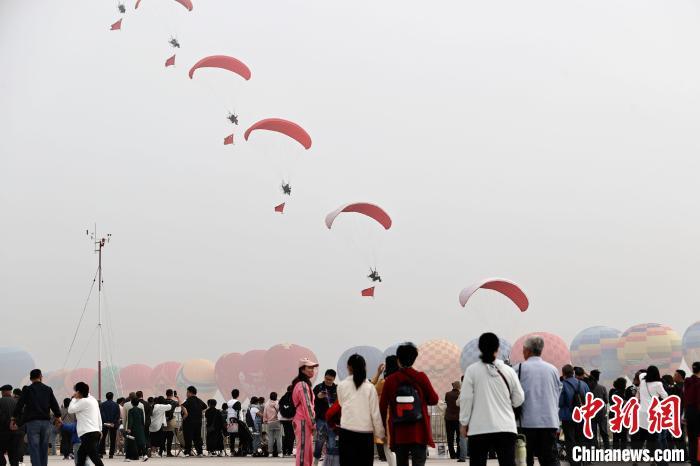 28日,2023太原国际通用航空博览会在山西太原尧城机场开幕。图为民众在观看动力悬挂滑翔机编队表演。 张云 摄