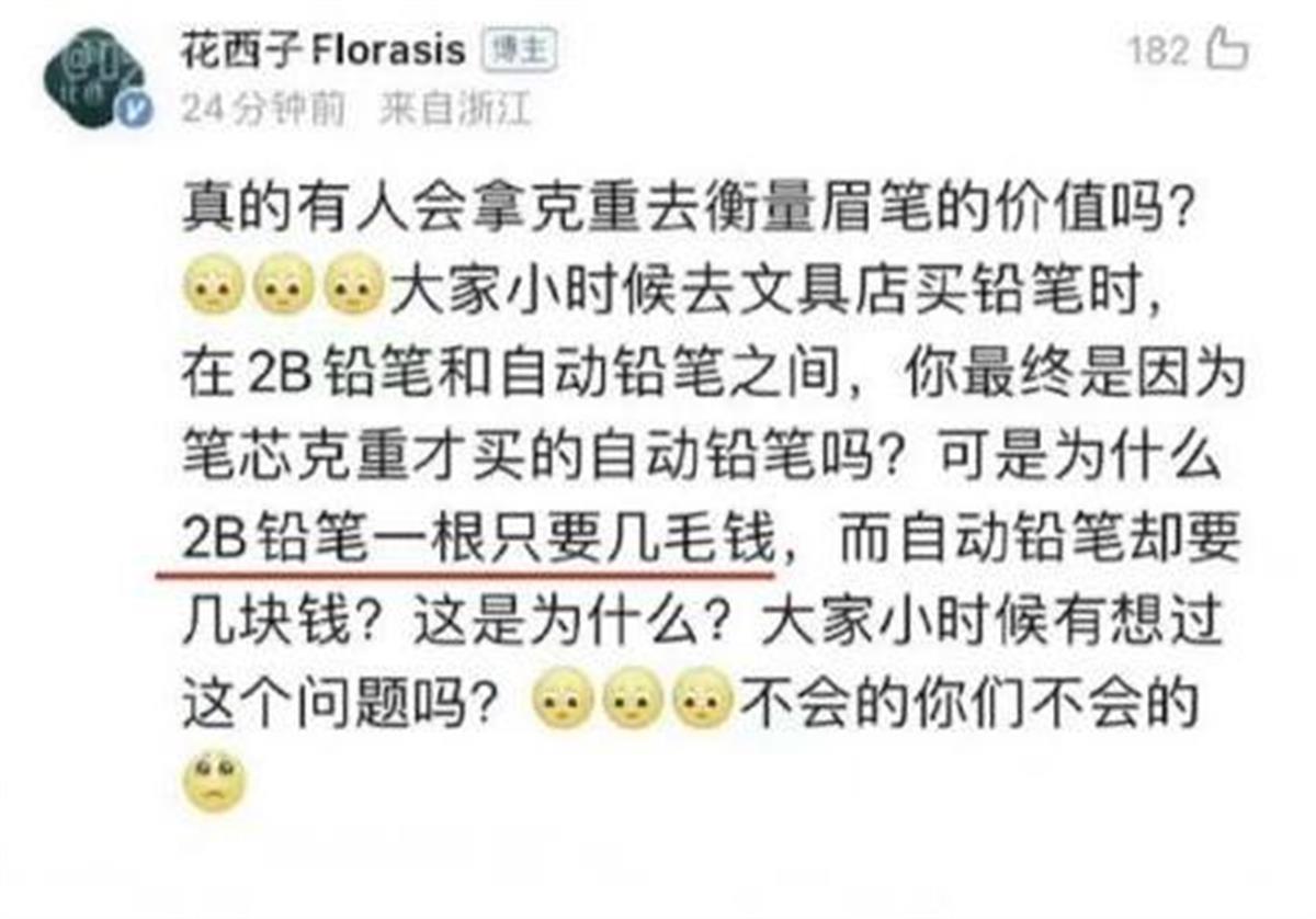眼见“掏心窝子”不管用,花西子开始了“发疯式”营销,发布了多条自夸文案,并多次在互动中回怼网友。在一条微博中,花西子以自动铅笔做比喻,疑似回应其眉笔产品价比黄金的说法:“真的有人会拿克重去衡量眉笔的价值吗?大家小时候去文具店买铅笔时,在2B铅笔和自动铅笔之间,你最终是因为笔芯克重才买的自动铅笔吗?可是为什么2B铅笔一根只要几毛钱,而自动铅笔却要几块钱?为什么?大家小时候有想过这个问题吗?”