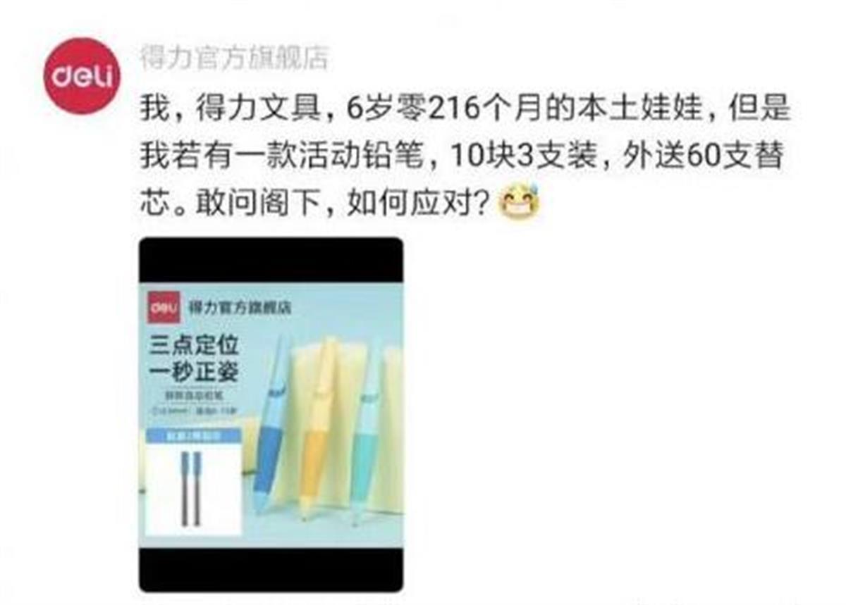 这种回怼网友的态度让花西子口碑进一步走低,反而又有其他国货品牌借势营销,文具品牌得力官方旗舰店发布视频称:“我,得力文具,6岁零216个月的本土娃娃,但是我若有一款活动铅笔,10块3支装,外送60支替芯。敢问阁下,如何应对?”28日,“泼天的富贵要到文具界了”登上热搜。