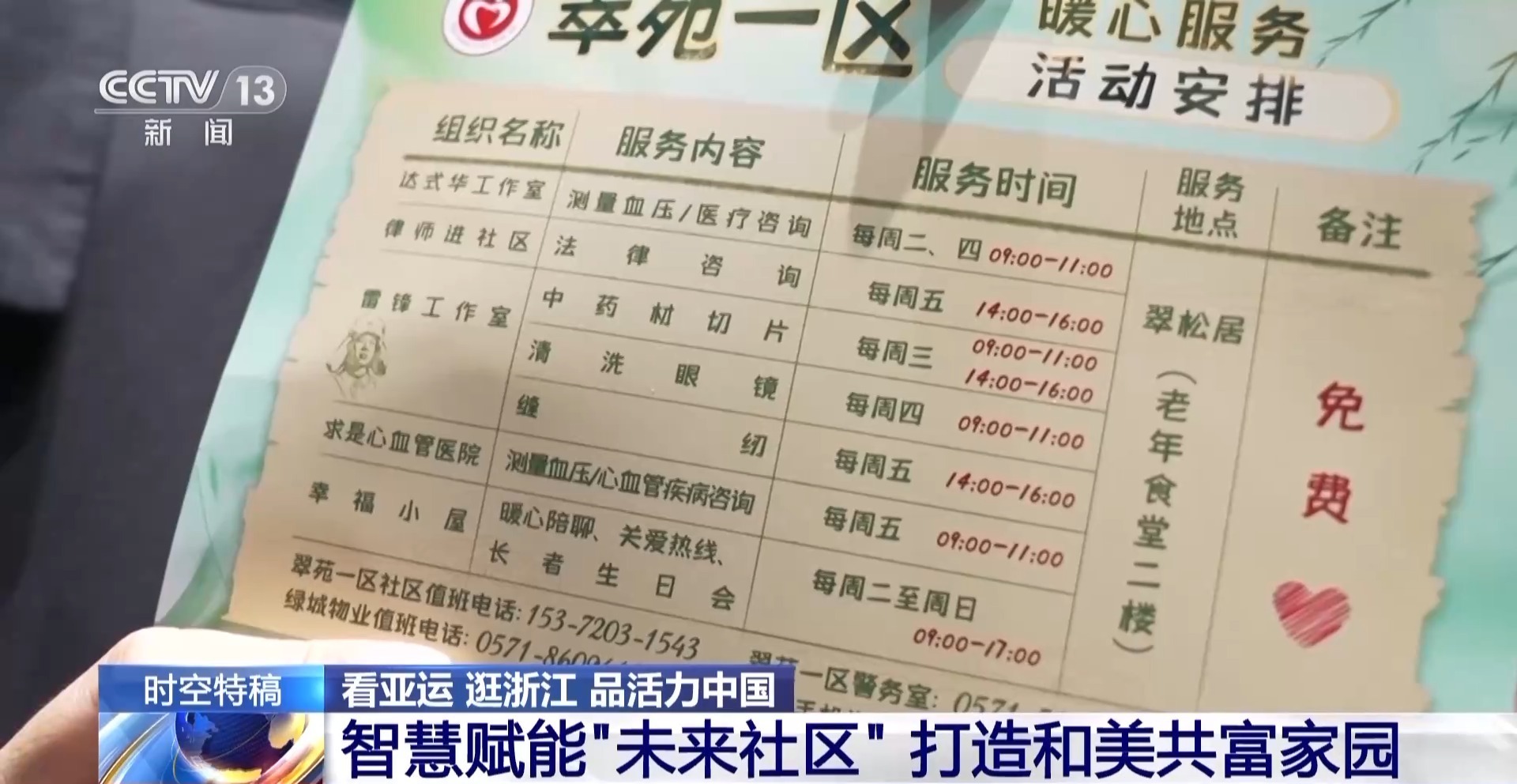 总台记者 李欣蔓:在老年人活动中心,我还看到了这样一张暖心服务活动安排。这里就涉及了身体健康方面的咨询、心理咨询、法律咨询,甚至细致到中药材的切片服务和眼镜的清洗服务。所以在这个未来社区,我们所感受到的是智能不仅仅是技术层面的创新和拓展,更多的是用智慧为大家提供暖心贴心更加美好的生活。