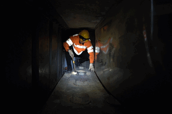 但由于检查平台的高度仅有一米半,狭窄的空间内,他们只能俯腰侧身进行作业。每隔几分钟,王志奔和工友们就要蹲下身子歇一下。
