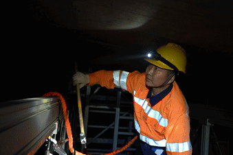 大约半个小时,他们检查完整个桥梁底面后,迅速整理好工具,走向下一个作业点,开始对7个桥墩的14个支座进行测量检查。