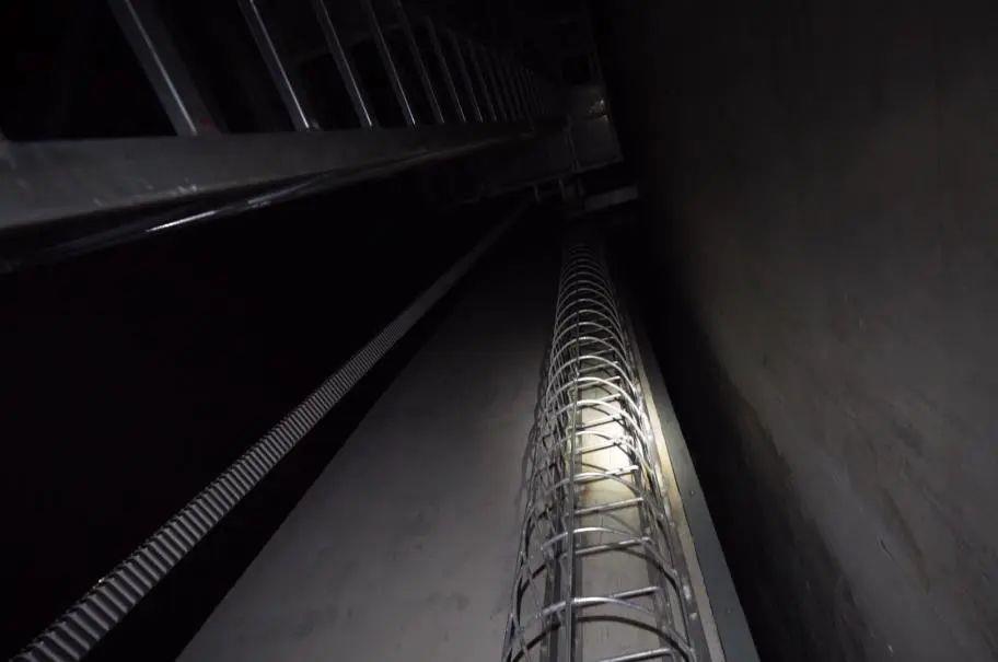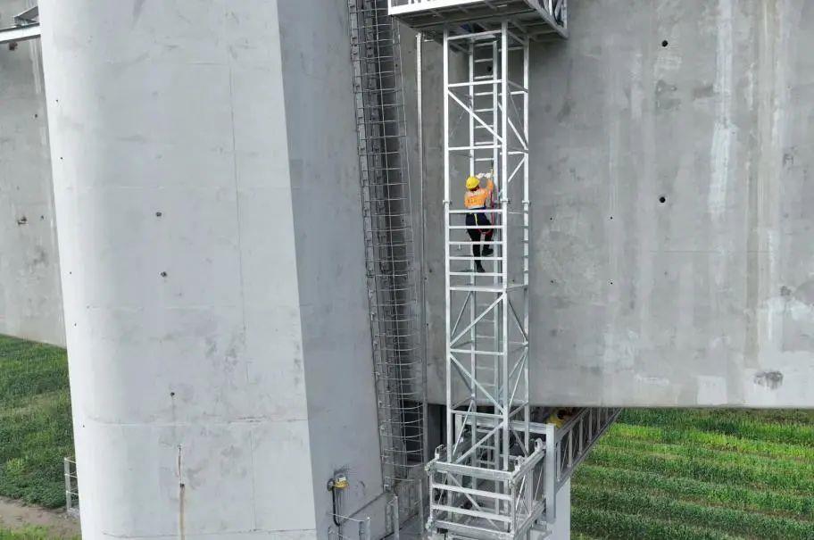 检查梯悬挂在桥梁外部,距离桥面10多米、距离地面30多米。白天观察,只见梁壁上一圈圈钢筋围着一条垂直阶梯,好似一个狭长的铁笼挂在桥侧,往下看一眼,便已是心惊胆战。