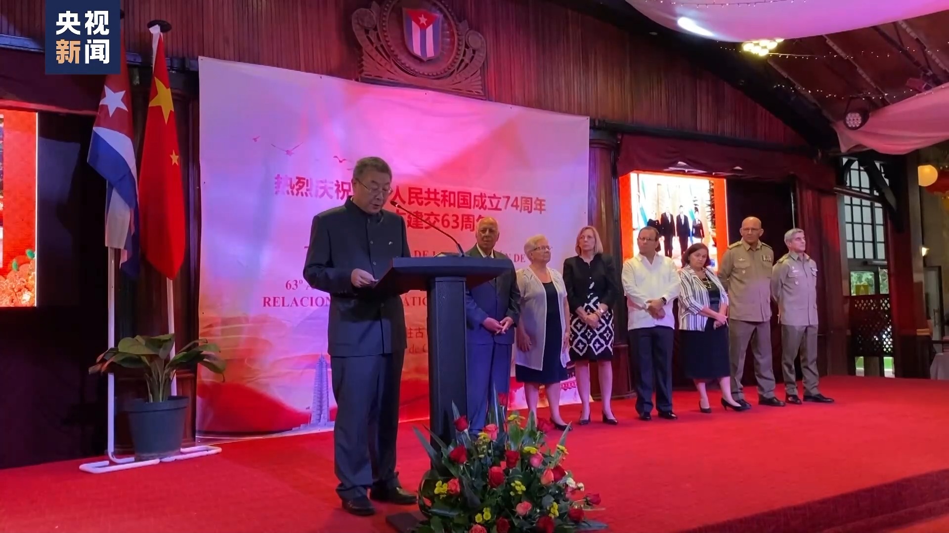 在中国驻古巴大使馆举行的国庆招待会上,中国驻古巴大使马辉发表致辞。他表示,中古两国关系已成为社会主义国家团结合作、发展中国家真诚互助的典范。古巴副总理卡布里萨斯、古巴政府官员、各国驻古巴使节以及古巴各界友好人士出席招待会。
