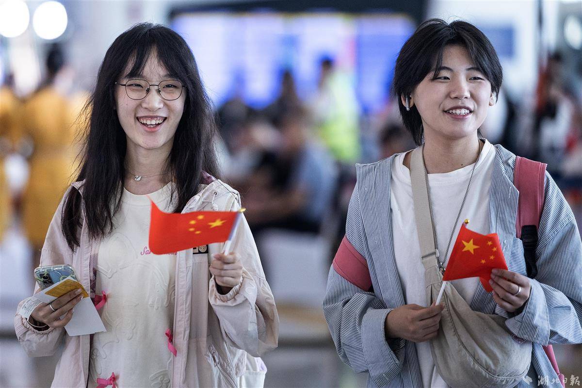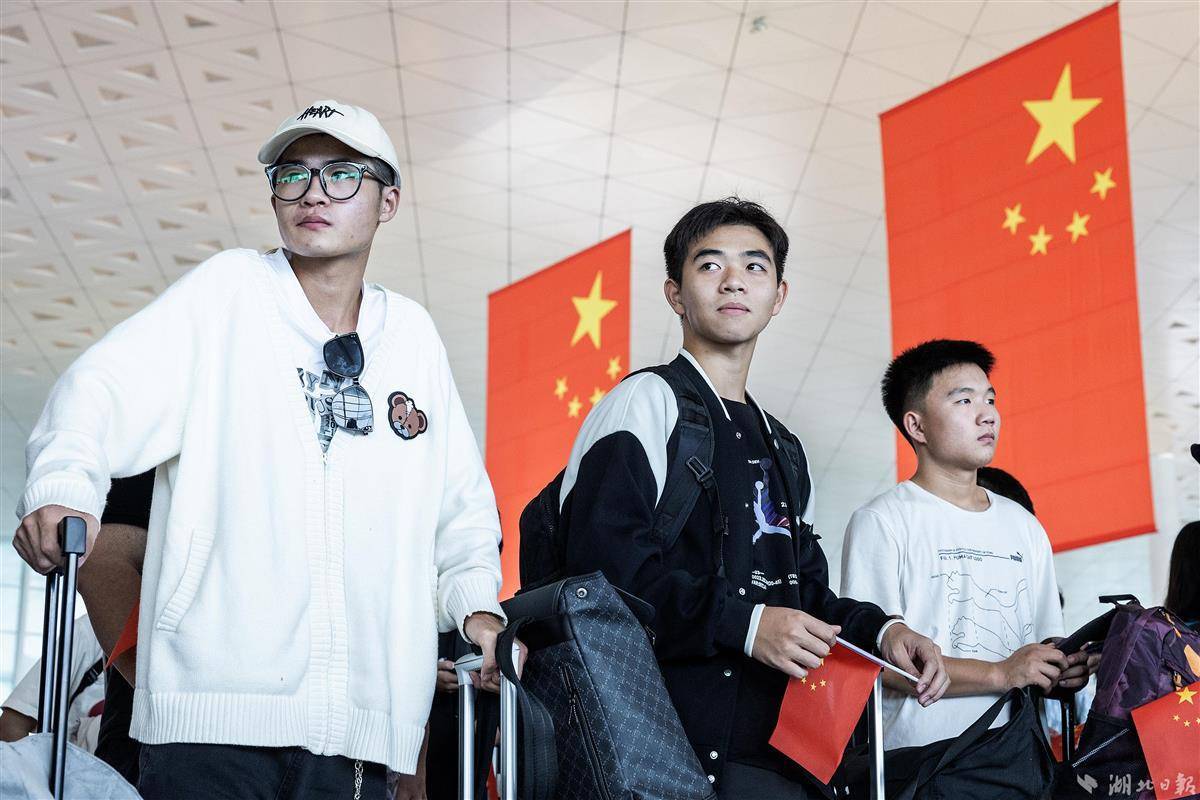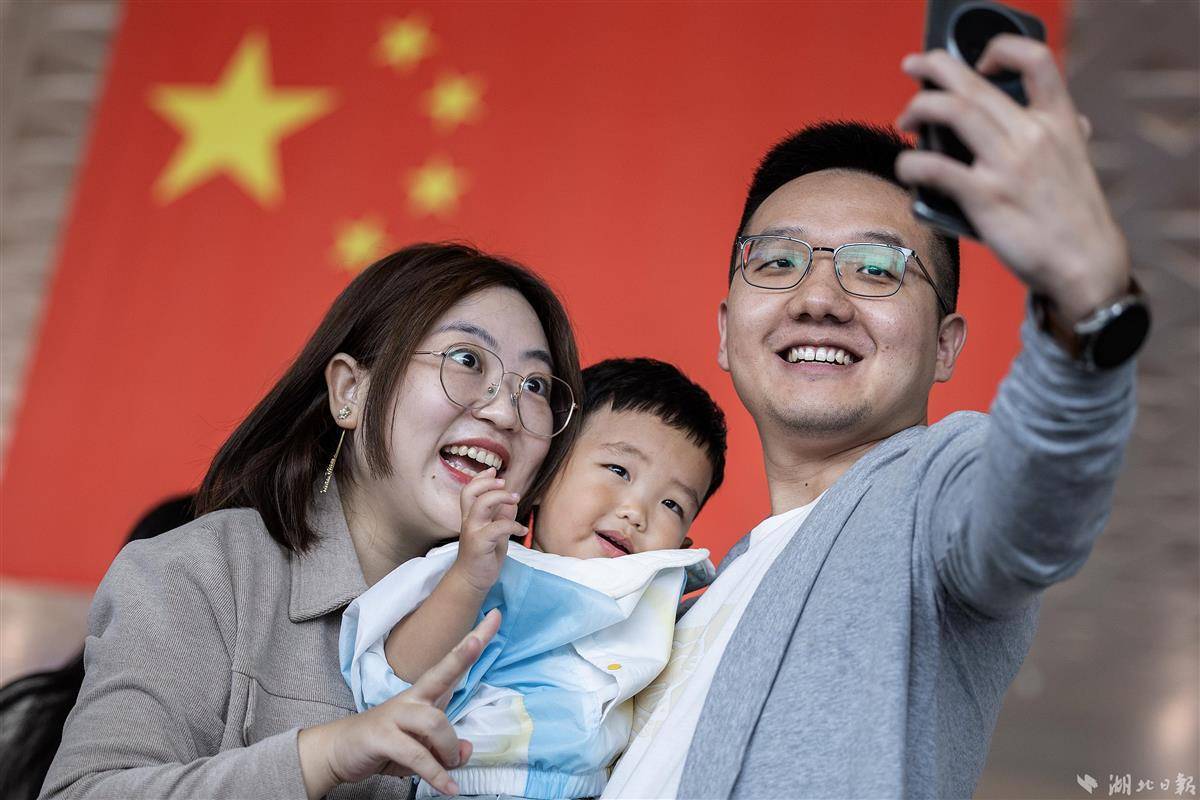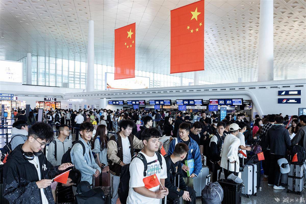 2023年9月29日,适逢中秋佳节,武汉天河机场出发层洋溢着浓厚的节日气氛,数面巨大的国旗悬挂在中庭,出行的旅客手持小国旗有序值机。