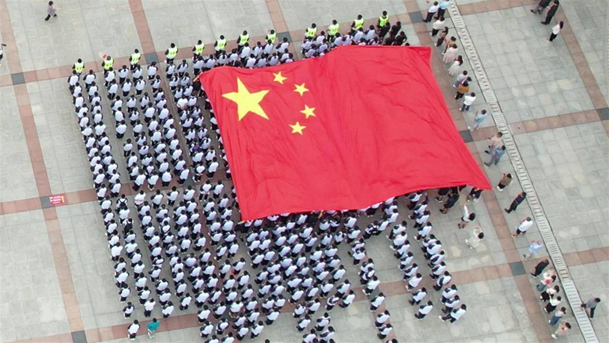 随后,师生们列队,排成方阵,巨幅国旗在师生们手中接力传递,将师生们的爱国心凝聚在一起。大家满怀激情地挥舞手中的国旗,翻涌起一片片红色的海浪。