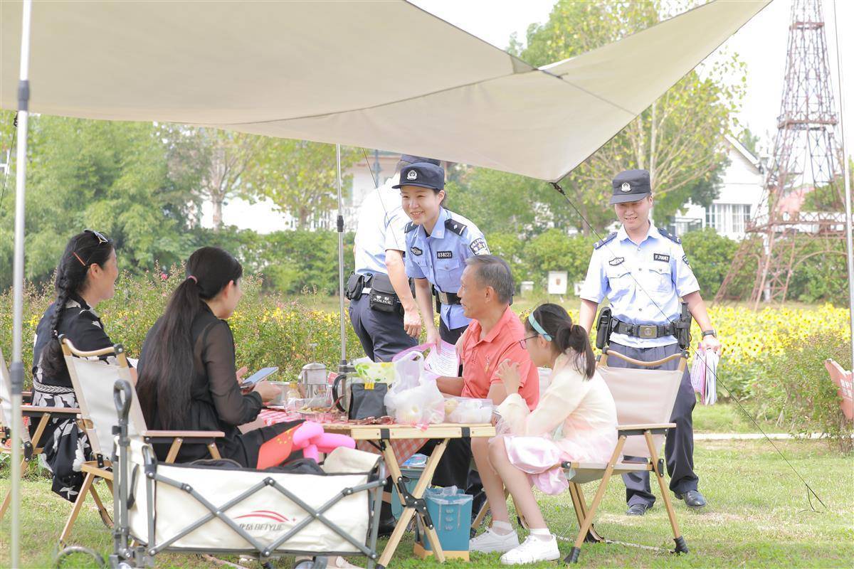 在花博汇景区,刚参警两个月的大集街派出所民警孙旷怡十分热情,帮游客订票指路,提醒游客照看好小孩,还趁机宣讲防诈骗知识。