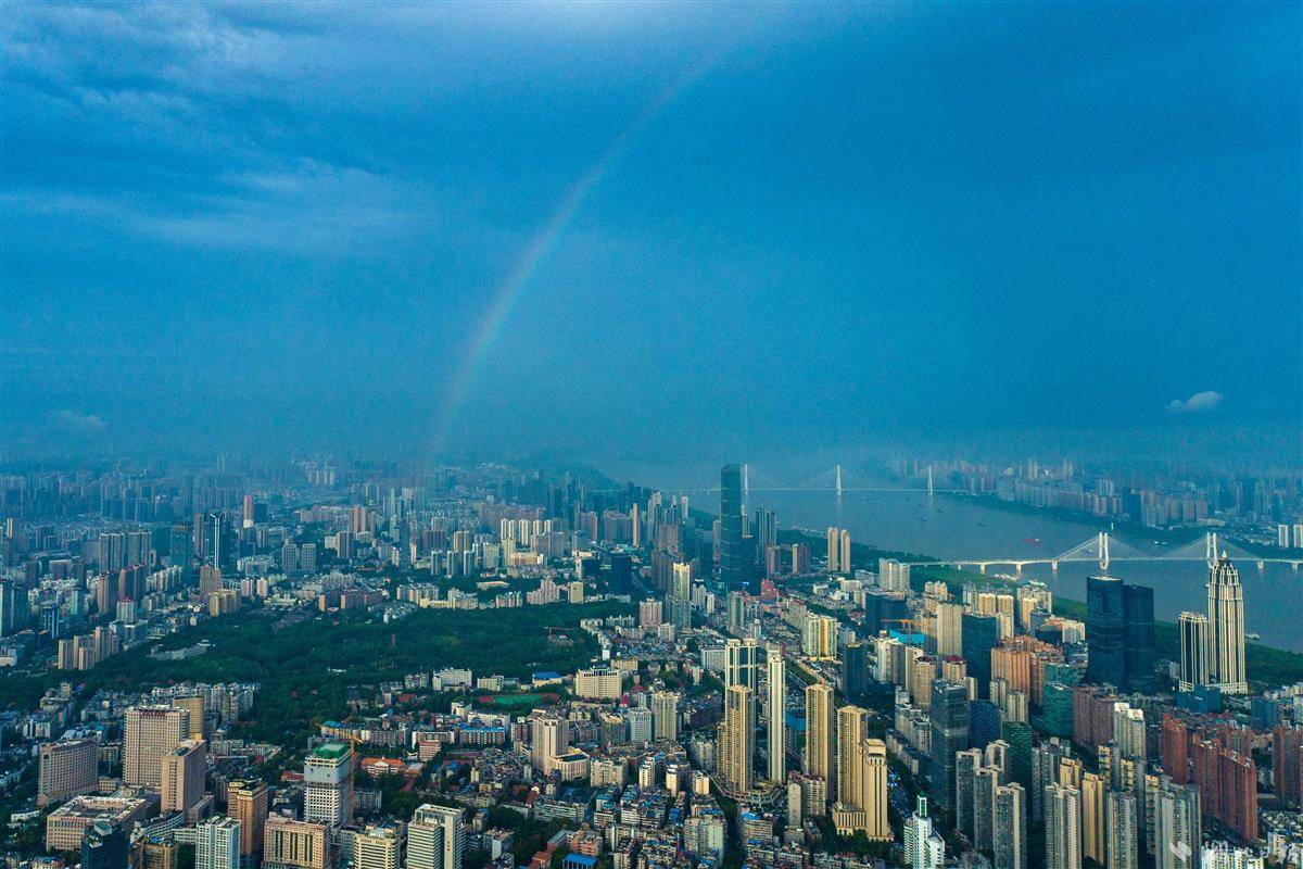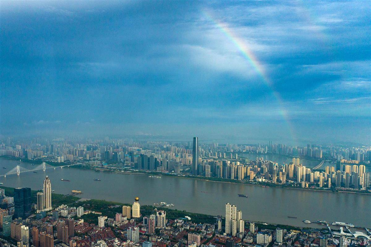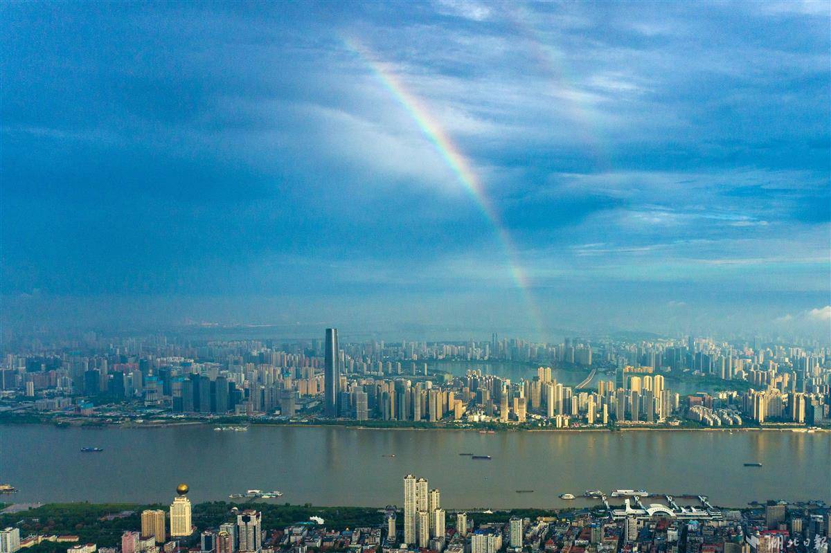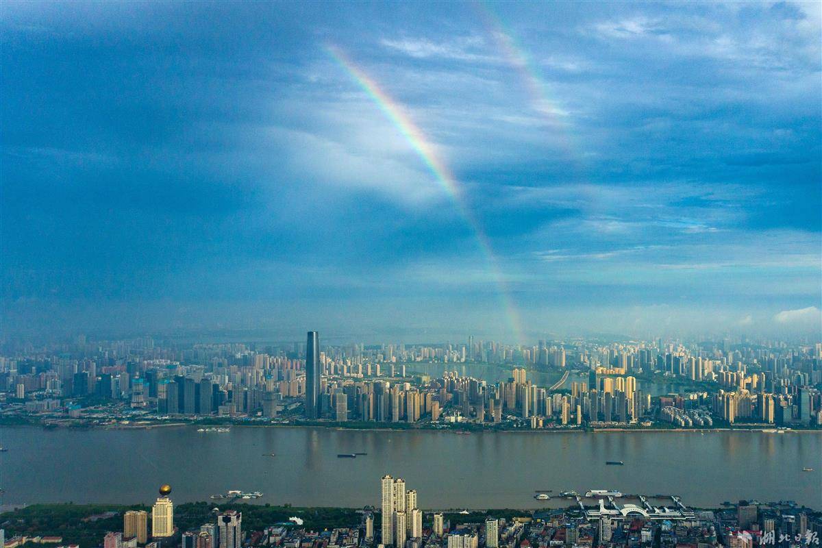 2023年9月30日傍晚时分,武汉城区雨后初霁,夕阳短暂破云而出,一道双彩虹横跨长江两岸,景象绚丽唯美。