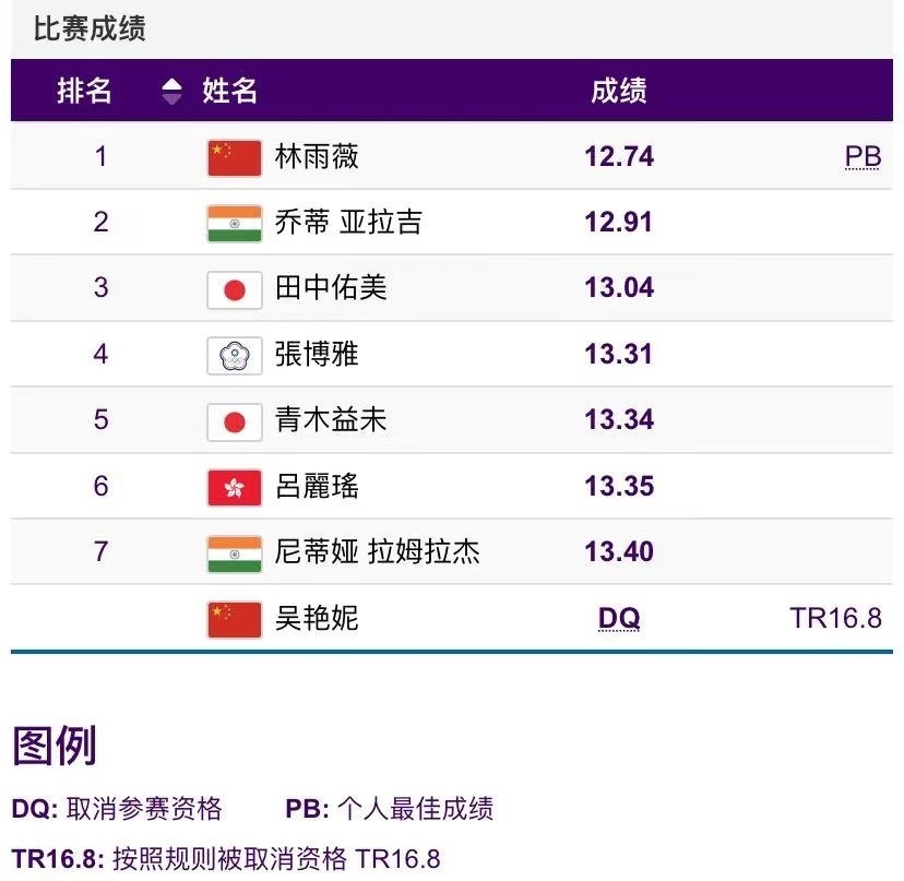 在杭州亚运会田径女子100米栏决赛中,发令枪响后,裁判判罚中国选手吴艳妮抢跑。吴艳妮提出申诉,随后,裁判决定先在运动员抗议下重新进行比赛。比赛恢复后,吴艳妮第二个冲过终点,不过比赛结束后,裁判最终判定她在第一次起跑时抢跑,并取消了她的成绩。印度选手递补银牌,日本选手拿到铜牌。