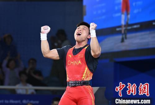 10月1日,中国选手谌利军以总成绩330公斤夺得杭州亚运会举重男子67公斤级金牌。图为谌利军在挺举环节试举180公斤成功后庆祝。 中新社记者 骆云飞 摄