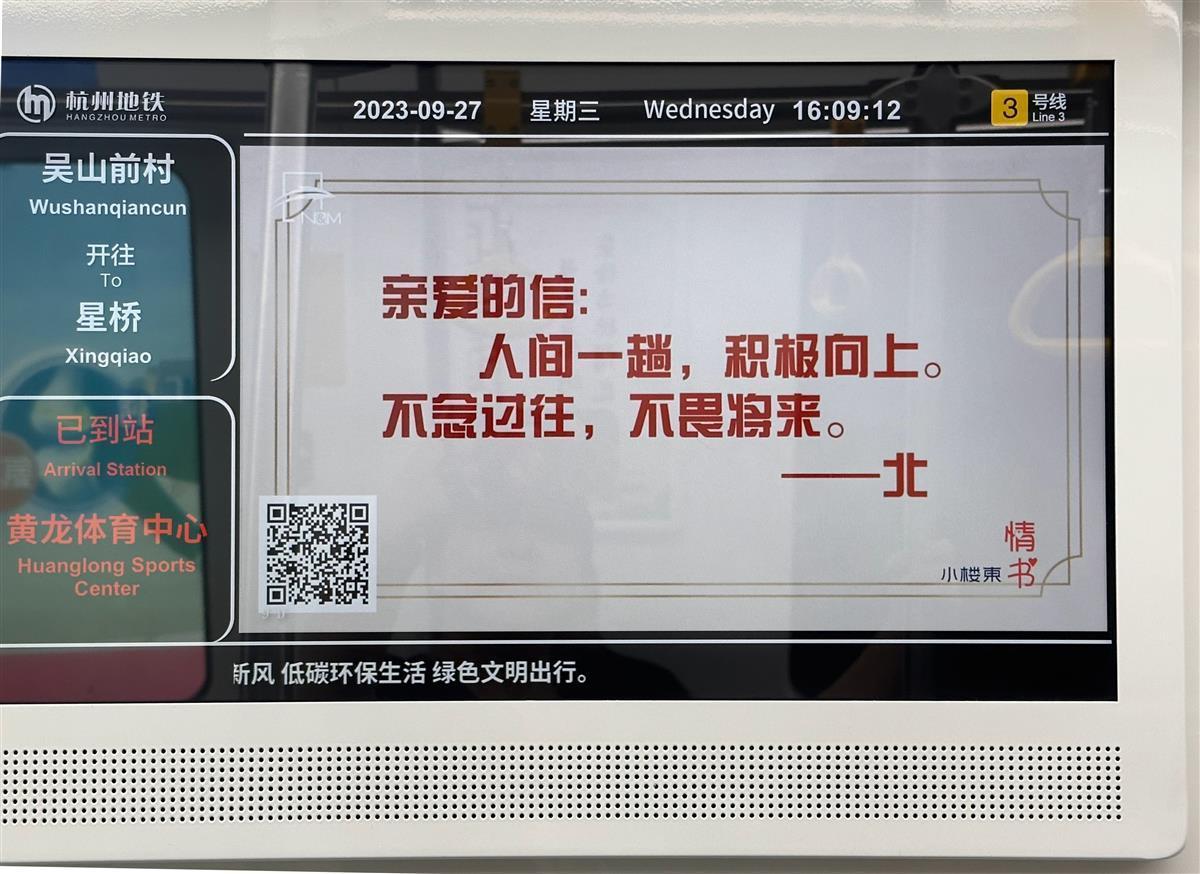 采访亚运会需要快速往返于各个赛场,坐地铁是个好选择。第一次乘坐地铁,我就发现了杭州地铁上有个很有意思的地方——在车厢里的显示屏上,滚动播放着一条又一条的留言,比如,“你是勇敢的孩子,敢于做真正的自己,健康快乐成长!”“人间一趟,积极向上,不念过往,不畏将来。”再比如,“你是我的小太阳。”“遇见你很开心,我们要一直在一起哦。”“我们的双向奔赴始终是我喜欢你的意义,等我回家。”