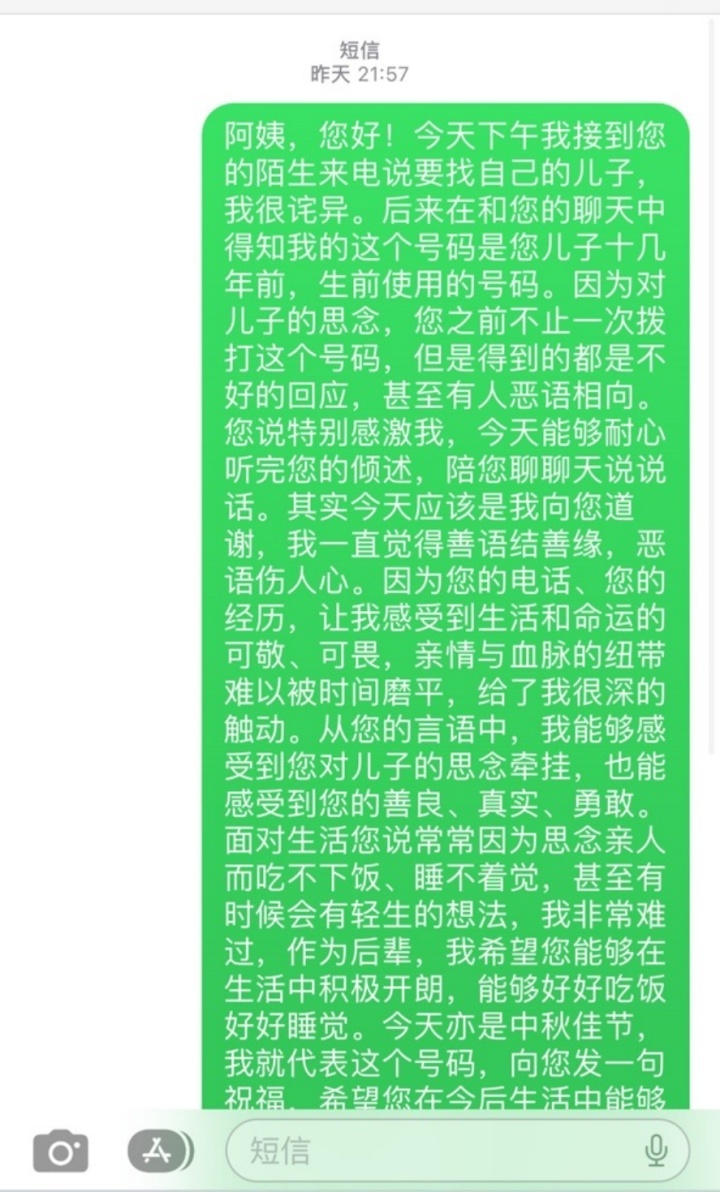 以前每到过节,阿姨就忍不住给儿子的这个号码打去电话,前些年这个号码的主人一听是打错电话,就挂了。阿姨就忍了好几年,没再拨打这个号码。
