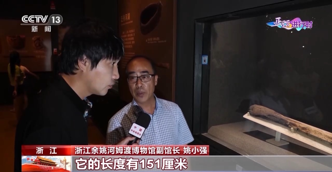 浙江余姚河姆渡博物馆副馆长 姚小强:它的长度有151厘米,这支桨是在河姆渡文化里面,出土的最大的一支木桨。当时河姆渡文化(时期)的船,已经是非常大了。我推测它尖头的木桨,就是这个船划出去,到湖泊里面去采集菱角、芡实的时候,船桨就插在湖泊的淤泥当中,相当于起到了一个锚的作用,采摘起来就更加容易一些。