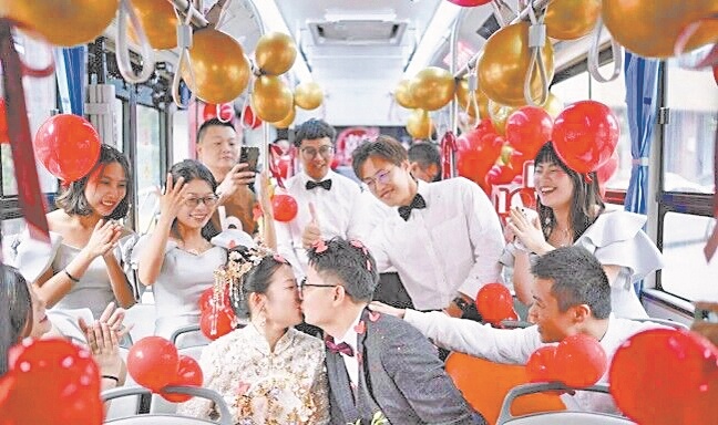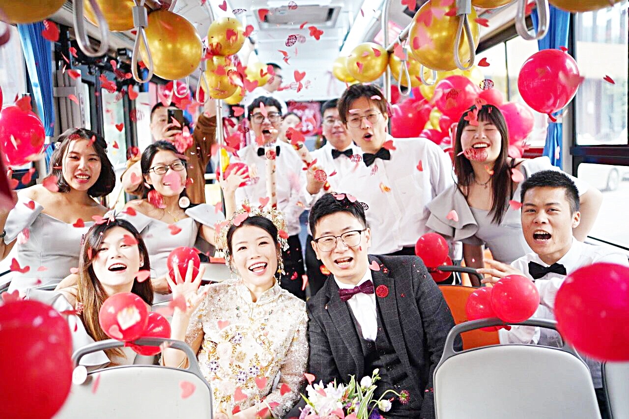 伴娘兴奋地说,她是第一次参加公交车上的婚礼,一般的婚车上只能坐几个人,但公交车上所有亲朋好友都能在一起,“一路欢歌着开往新郎家,氛围特别喜庆欢乐,这种出行方式非常好。”