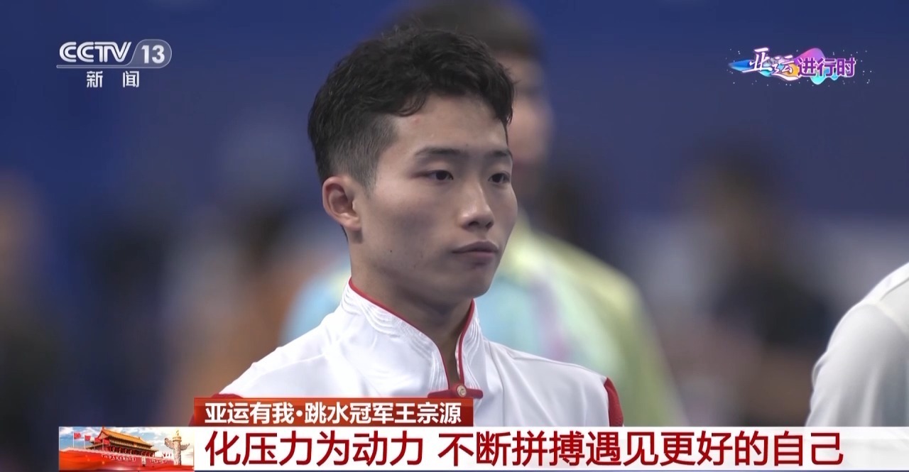 国家跳水队运动员 王宗源:整场比赛过程当中其实出现了很多问题,特别是心态上的,很明显在几个自己很拿手的动作出现了一些问题,所以导致了整场比赛只能说给自己打个五六分。最后一跳是自己立刻调动了回来,找到了自己该有的比赛节奏,所以最后一跳自己能“咬住”,才能够摘得这枚金牌。