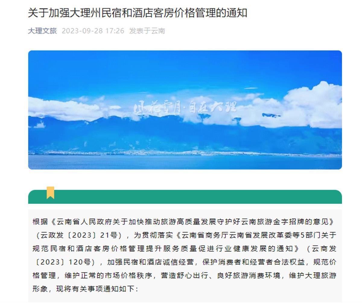 关于加强大理州民宿和酒店客房价格管理的通知(“大理文旅”官方微信供图)