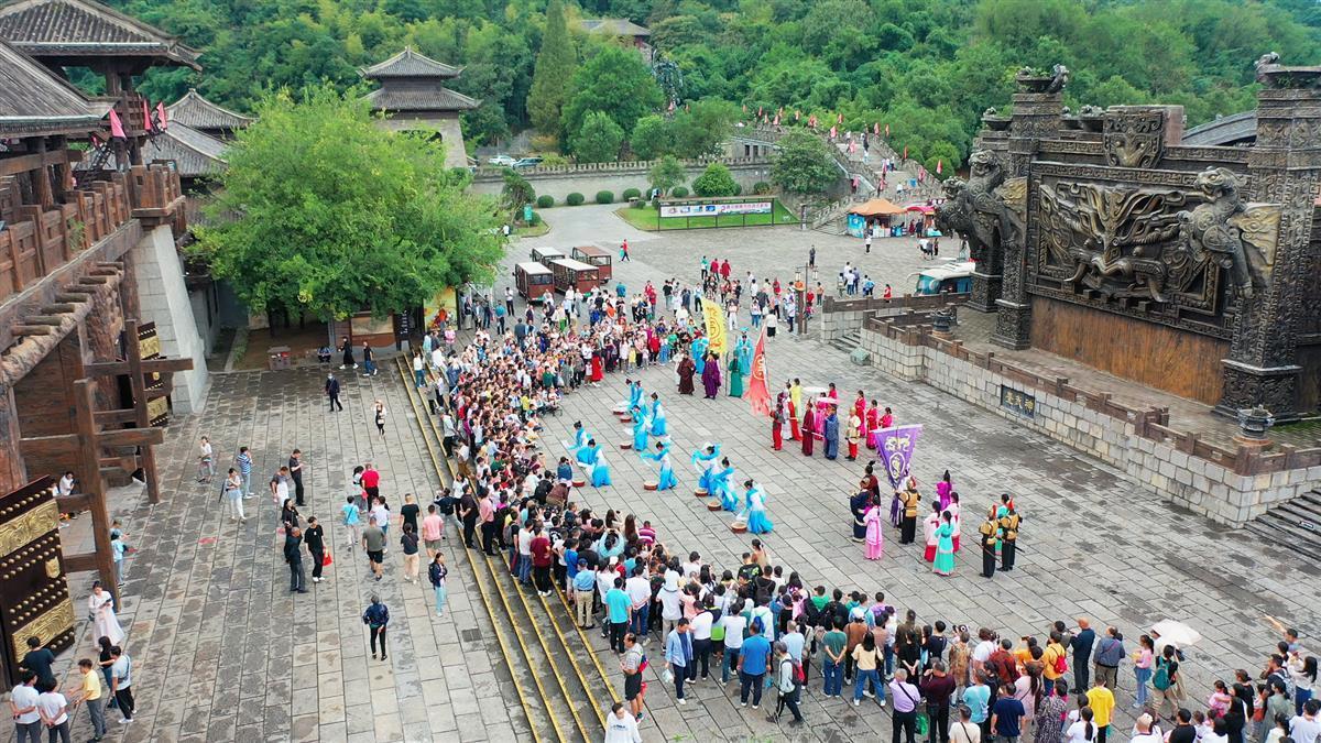 气势雄伟的仿古城门,一位位身着金色战服的将士,手持战旗列队而出,围站在景区大门广场。随着“咚咚咚”的战鼓声不断加速响起,众多士兵举战旗跑出,几名战士翻腾、跳跃展示着拳脚功夫。伴随战马奔腾而出,张飞、诸葛亮、周瑜、庞统等一位位三国英豪向游客迎面走来。