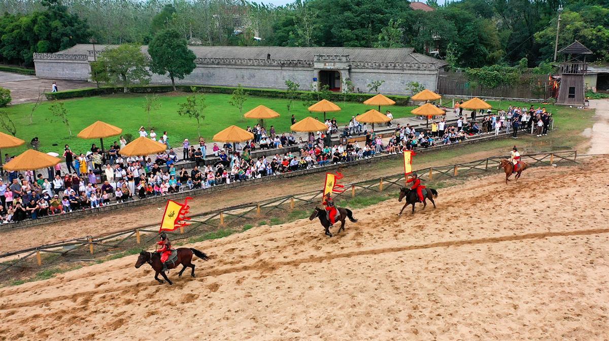 现场引导游客的志愿者王世杰告诉记者,开园迎宾表演每天上午9时进行,一共有80余名演职人员参加,还有9匹战马、11位豪杰扮演者,能够快速、直观地重现古战场氛围。