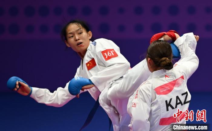 10月5日,中国选手李巧巧(蓝方)以4比0战胜哈萨克斯坦选手劳拉·阿利库尔(红方),夺得杭州亚运会空手道女子组手68公斤级决赛冠军。 中新社记者 王刚 摄