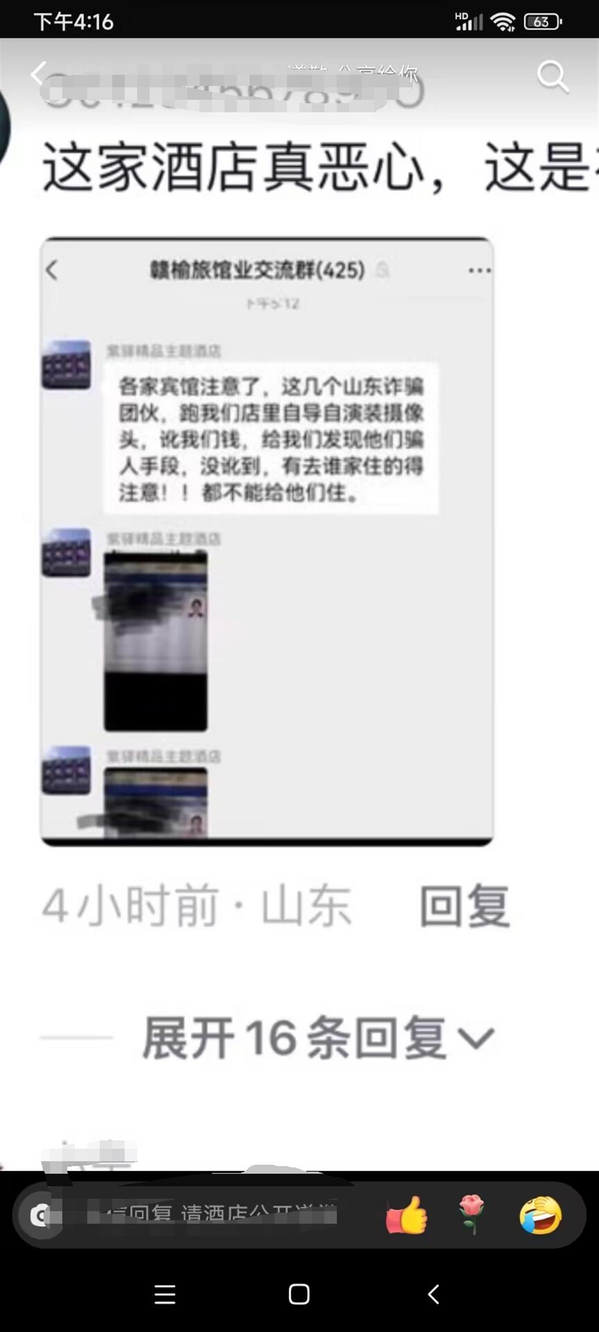 该事件的受害人刘女士告诉极目新闻记者,她刚刚得知当地警方抓获犯罪嫌疑人的消息,庆幸自己和同伴的清白终于得到了证明,但他们至今未收到酒店方的道歉。刘女士还称,他们在10月5日下午发现,疑似紫驿精品主题酒店的相关人员在一个名为“赣榆旅馆业交流群”的群里发布消息称,几个“山东诈骗团伙”在自己店里自导自演装摄像头,讹自己的钱,还将他们一行人的身份信息发布到群里。