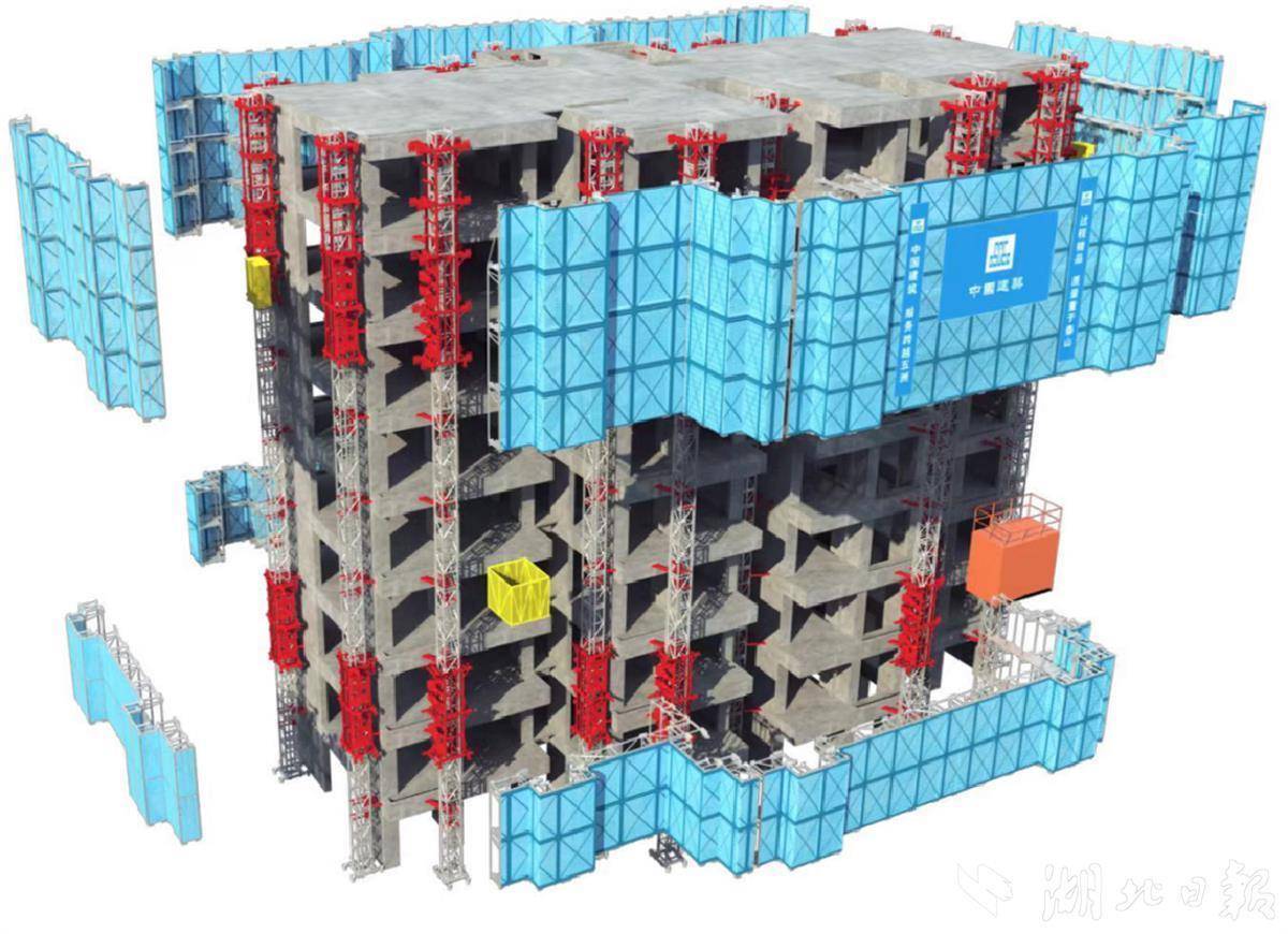 其内部由上而下覆盖三层半的建筑结构层,形成工厂化流水线。百米高空,建筑工人们不用日晒雨淋,在钢罩内各作业层接力完成钢筋绑扎、模板支设、混凝土浇筑和养护等。随着工序逐步完成,空中造楼机逐层顶升直至大楼建成。