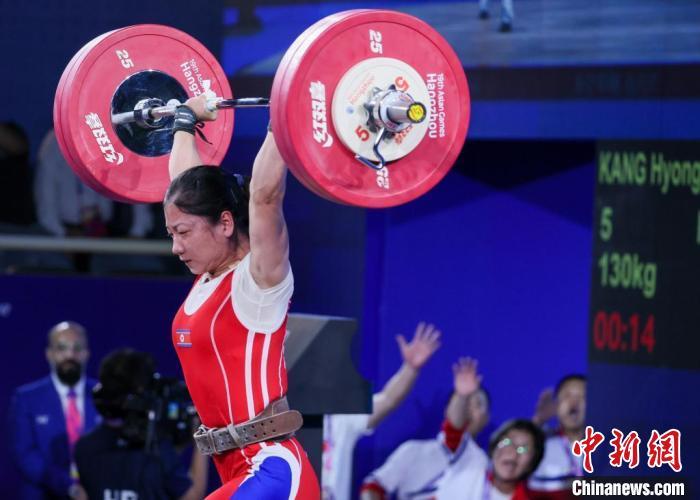 9月30日,杭州亚运会女子举重55公斤级比赛在杭州萧山体育中心举行。朝鲜选手江贤京以103公斤、130公斤、233公斤的成绩刷新女子举重55公斤级抓举、挺举、总成绩三项世界纪录,并夺得该项目冠军。 中新社记者 贾天勇 摄