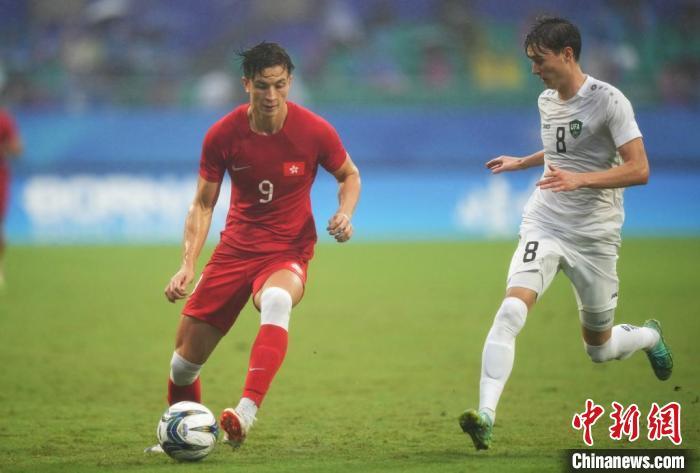 10月7日,杭州第19届亚运会男子足球铜牌赛在杭州上城体育中心体育场举行。乌兹别克斯坦队(白方)以4比0战胜中国香港队(红方)获得季军,中国香港队获得第四名。图为中国香港队9号球员安永佳带球突破。 中新社记者 田博川 摄