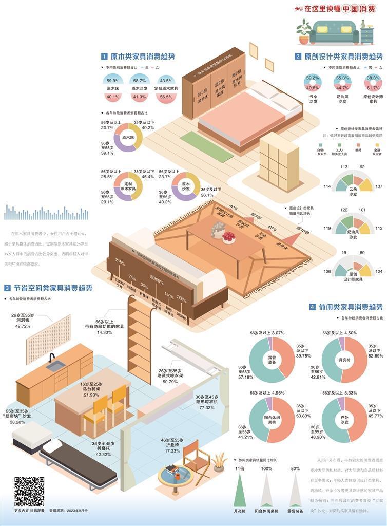 人们对生活品质和审美的追求在居家环境改善上体现得更为明显,也给相关行业带来利好。其中,女性对舒适的睡眠更为重视,在原木家具的消费者中,女性用户占比超40%;奶油风、云朵沙发深受年轻用户喜爱,35岁以下年轻消费者占比超60%;原创设计师家具在职场人中有更大市场,金融从业者的消费额增长达350%。