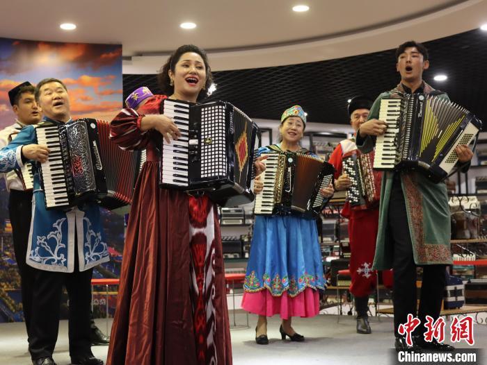 近日,记者走进伊宁市六星街,由锡伯族、哈萨克族、俄罗斯族、汉族、维吾尔族等音乐爱好者组成的手风琴乐队正在表演。 中新社记者 薄雯雯 摄