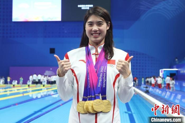 9月29日晚,杭州第19届亚运会游泳比赛在杭州奥体中心游泳馆落下帷幕,张雨霏展示其在杭州第19届亚运会获得的6枚金牌。 中新社记者 汤彦俊 摄
