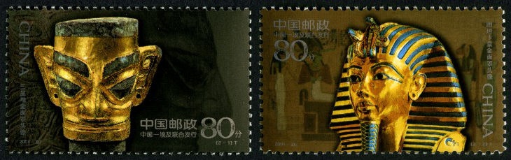 △ 2001年10月12日与埃及联合发行的《古代金面罩头像》邮票,其中就有三星堆金面罩头像。点击查看它背后的故事