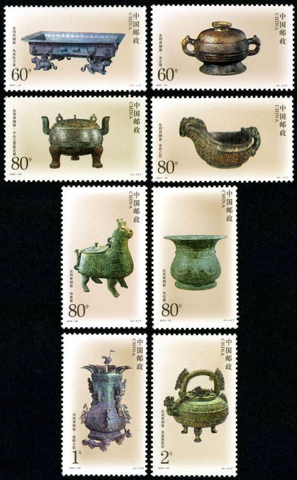 △ 2003年12月13日发行的《东周青铜器》邮票,一套8枚。其中包括春秋中期青铜器“莲鹤方壶”(左下)。点击查看它背后的故事
