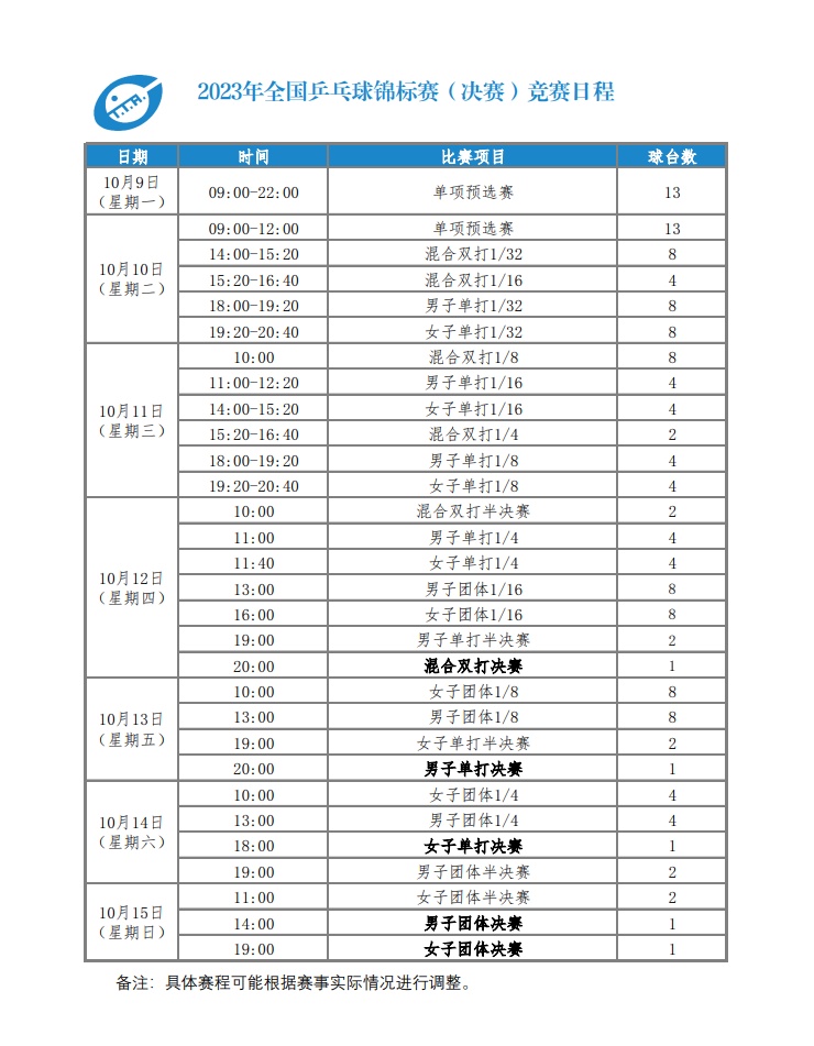 10月9日至15日,2023年全国乒乓球锦标赛(决赛)在江苏扬州体育公园举行。