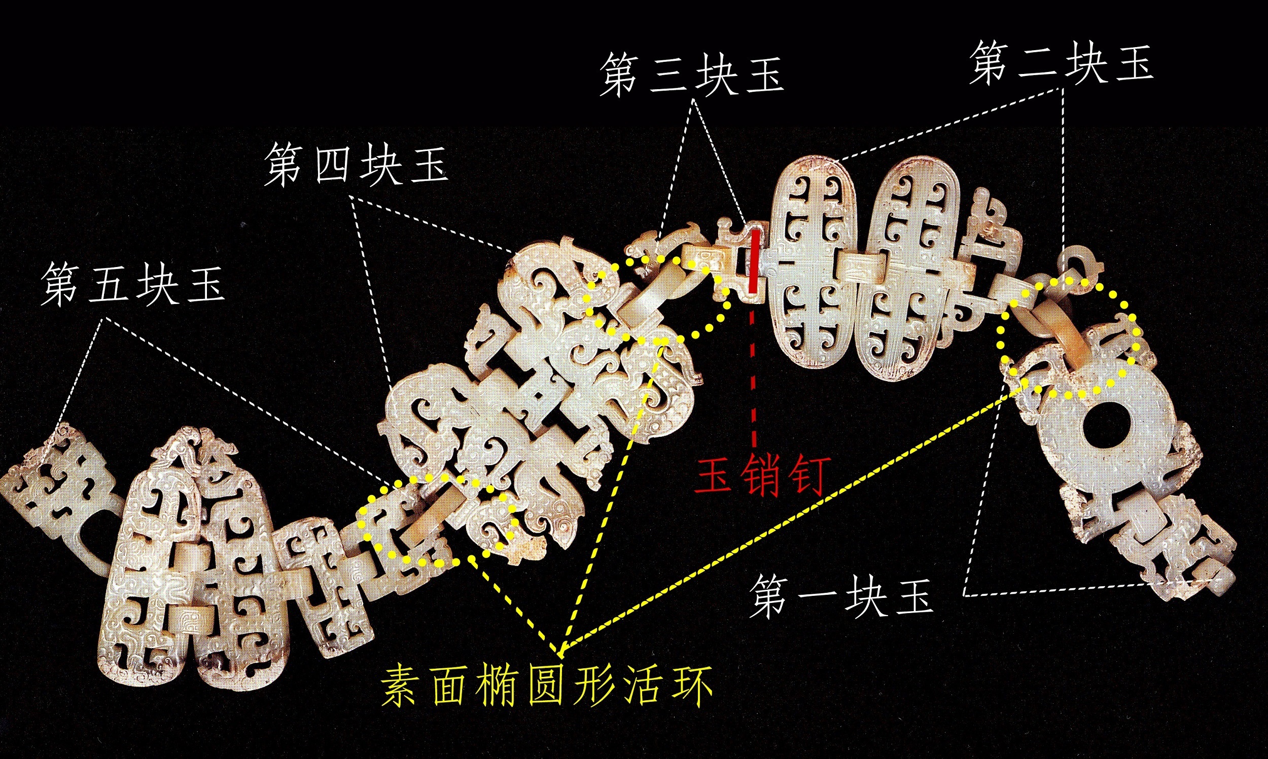 它由5块玉料、3个素面椭圆形活环及1根玉销钉雕成