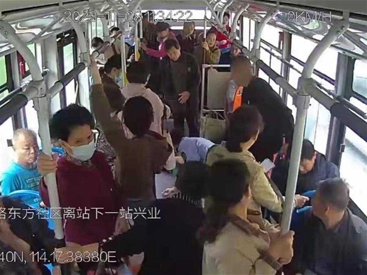 据车上乘客彭女士的母亲介绍,10月8日11时33分,她乘坐592路公交车回家,刚过兴业路东方社区公交站没多久,公交车后门附近一位身穿绿色T恤衫、看上去60多岁的男乘客突然晕倒,瘫软在地。
