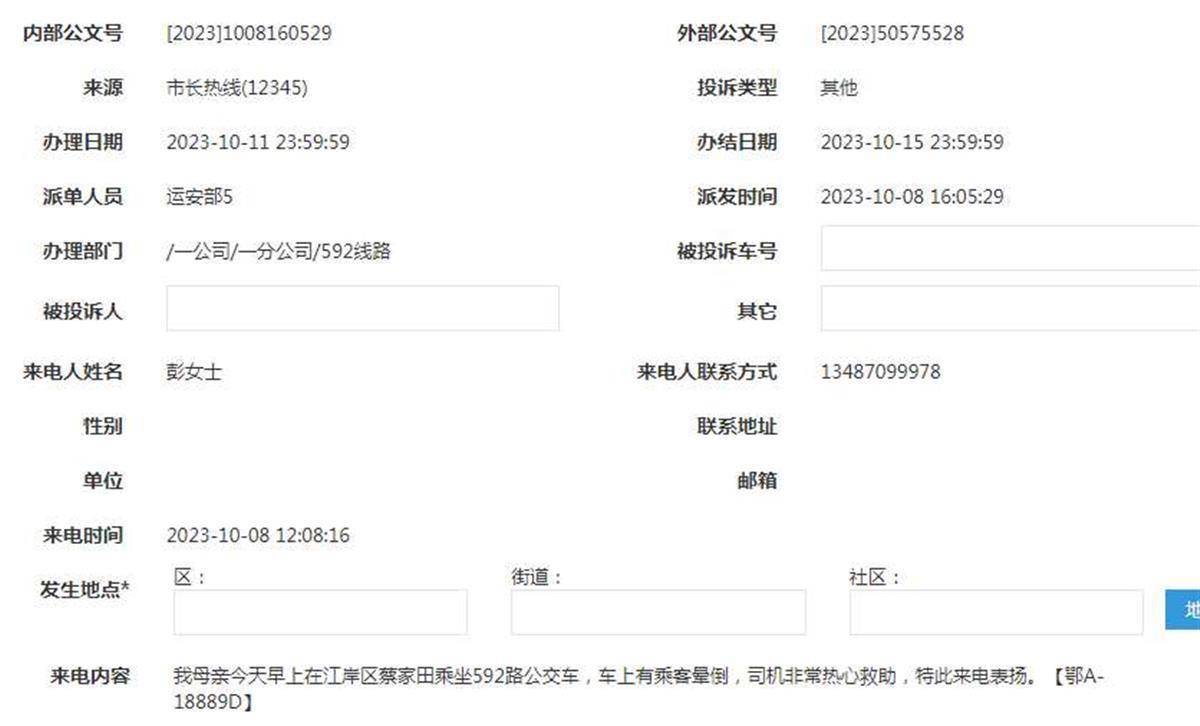 目睹车厢的整个救助过程,彭女士的母亲分外感动,回家后便将乘车遭遇讲给女儿听,并委托彭女士拨打市长热线,对592路司机及一车乘客的暖心举动进行表扬:“真是一车热心人,武汉确实太有爱了!”