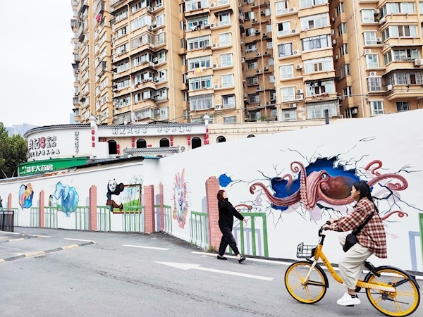 10月10日,位于武汉市武昌区友谊大道与秦园路交会处的口袋公园旁,一排绘有熊猫、兔子、章鱼、大象等卡通形象的裸眼3D墙画把老旧围墙装饰一新,成为居民新的打卡点。