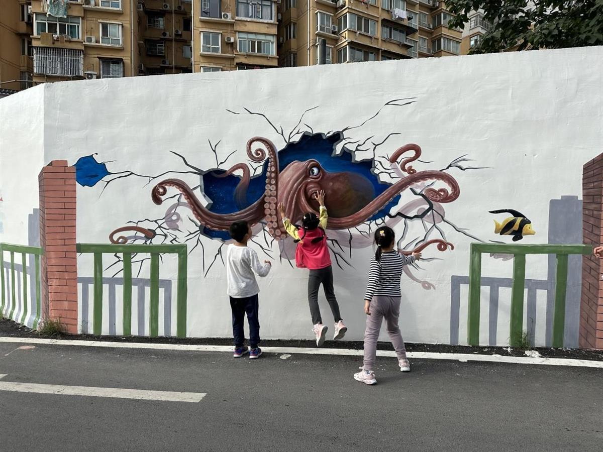 10月10日,市民吴先生带着孩子小阳,行至武汉市武昌区秦园路与友谊大道交叉口的口袋公园旁,眼前出现了一面裸眼3D“童趣墙”,吸引了不少居民和路人来拍照打卡。