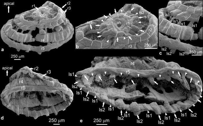 该化石第1环和第2环为同圆心且共平面,它们之间有明显的空隙。第2环到第5环紧密贴合,形成圆台状结构。第1环与第3环之间通过19条辐射状结构连接,第3环和第5环之间有36条纵向结构连接。
