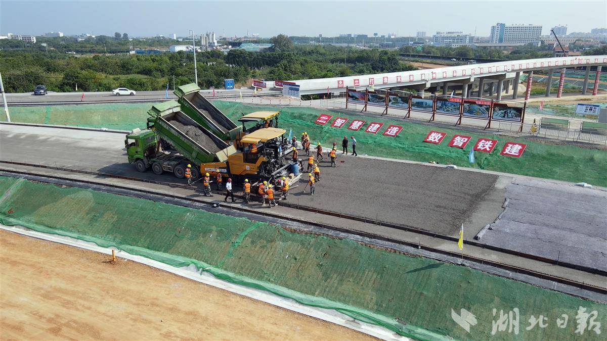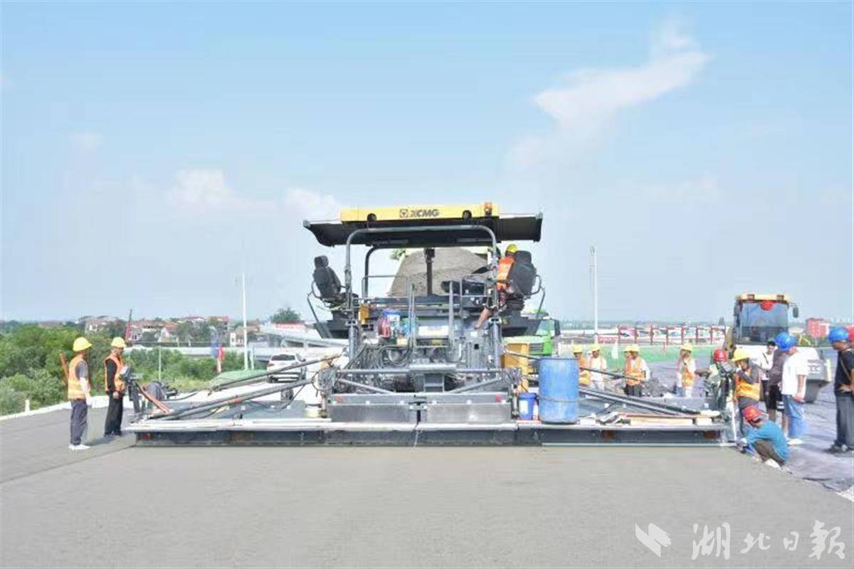 在中铁十一局京港澳改扩建工程4标项目建设的孝感东互通匝道上,货车将水泥倒入一辆黄色摊铺机车斗中,水泥经过螺旋旋转散料后,随即“吐”出,并被均匀熨平。“最宽可以一次性摊铺12米的,宽度可以随时调节。”项目部经理苗涛介绍,设备可以根据施工现场实际情况精准控制摊铺的厚度和坡度。