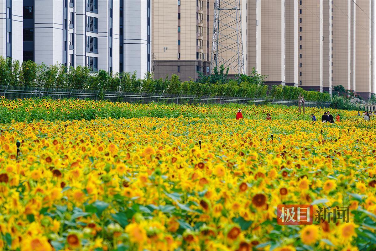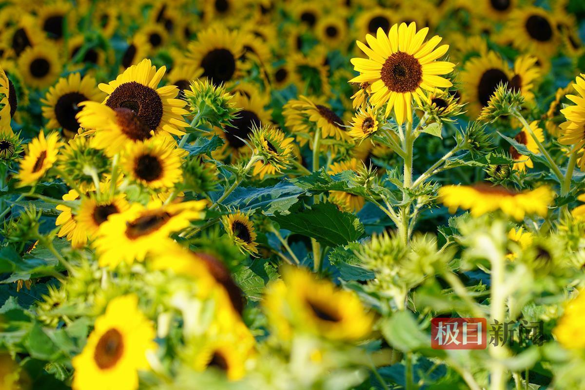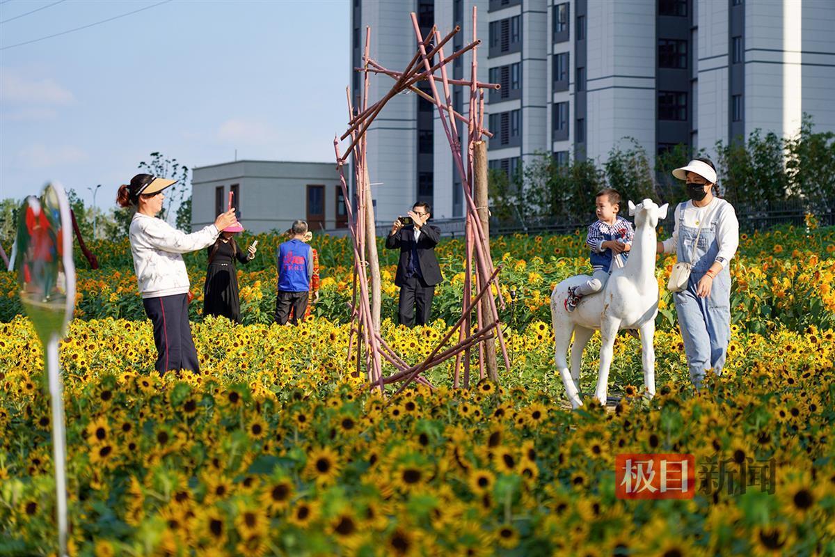 10月11日,记者来到向日葵花海处看到,市民游客三五成群或穿梭在花海中,近距离欣赏向日葵,不时摆出各种姿势与花海合影,一株株向日葵迎着阳光绽放笑颜,硕大的花盘在翠绿枝叶的映衬下显得分外明丽动人。微风拂过,花海涌动,葵花轻晃着小脑袋,一团团紧紧簇拥在一起,让人感觉走进了一幅诗情画意的田园风情画。